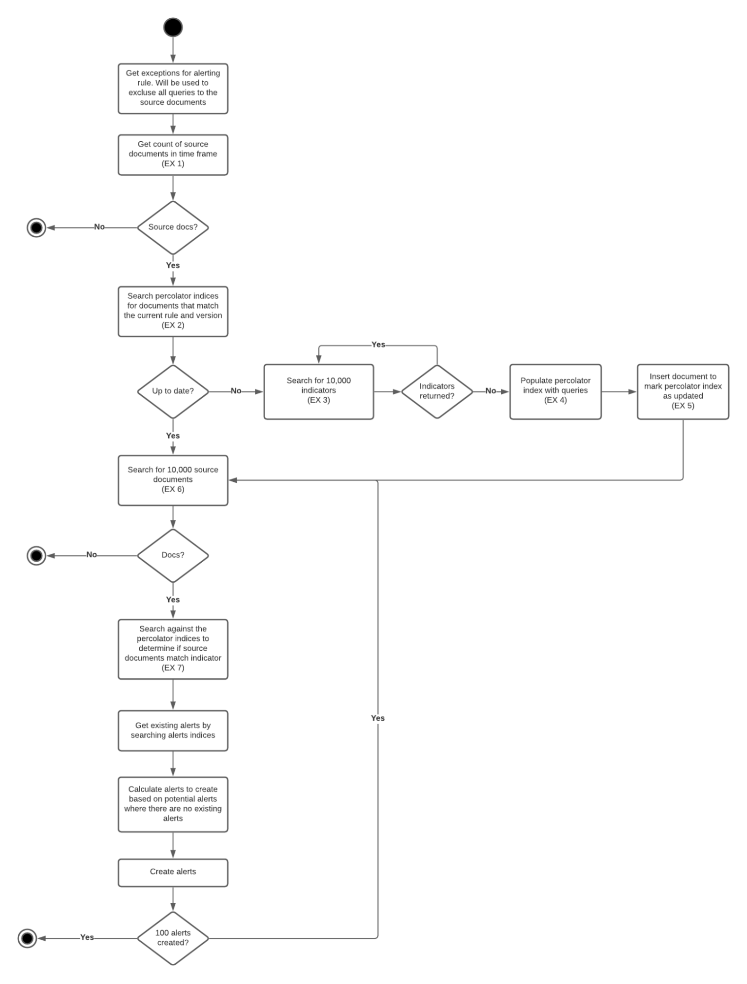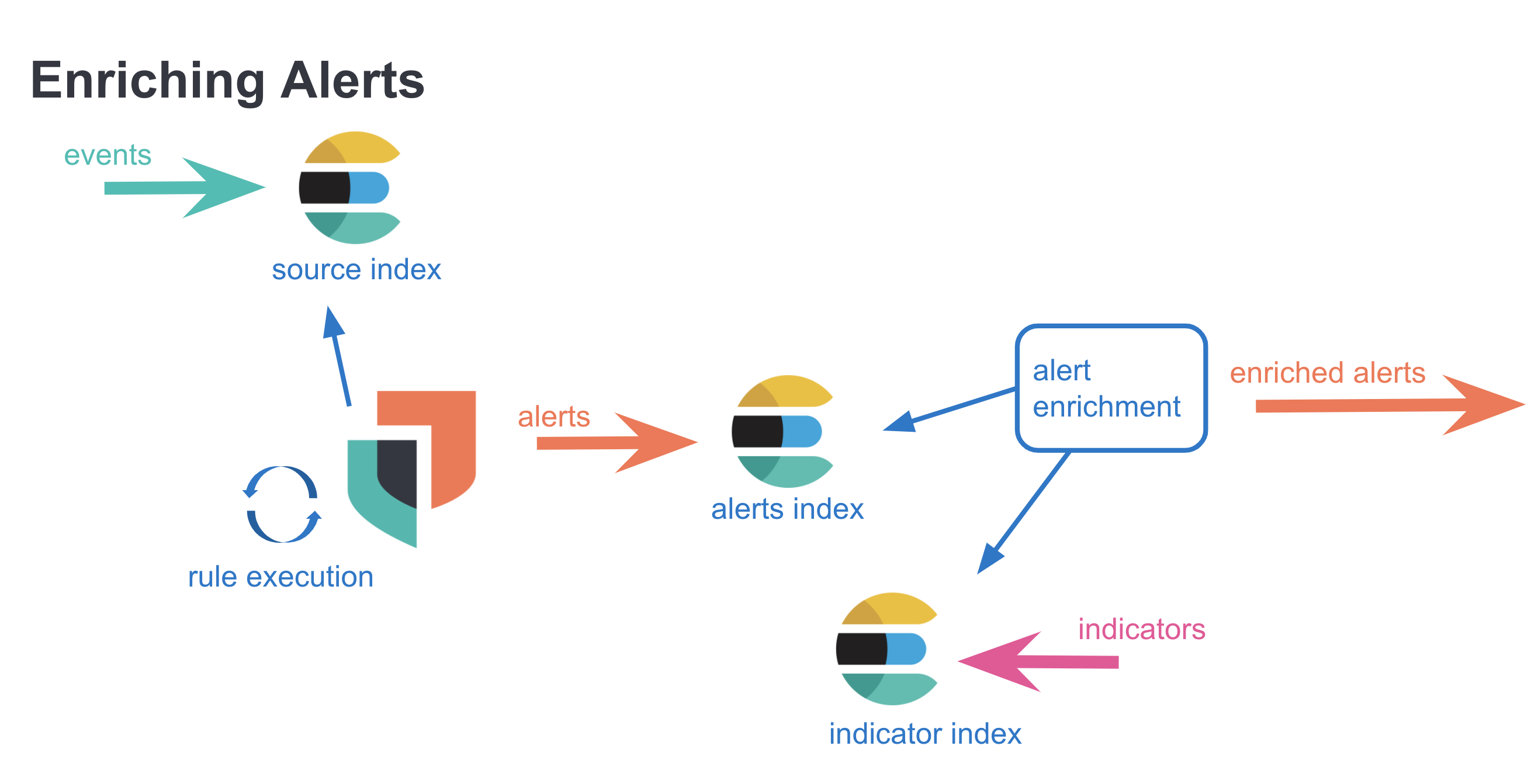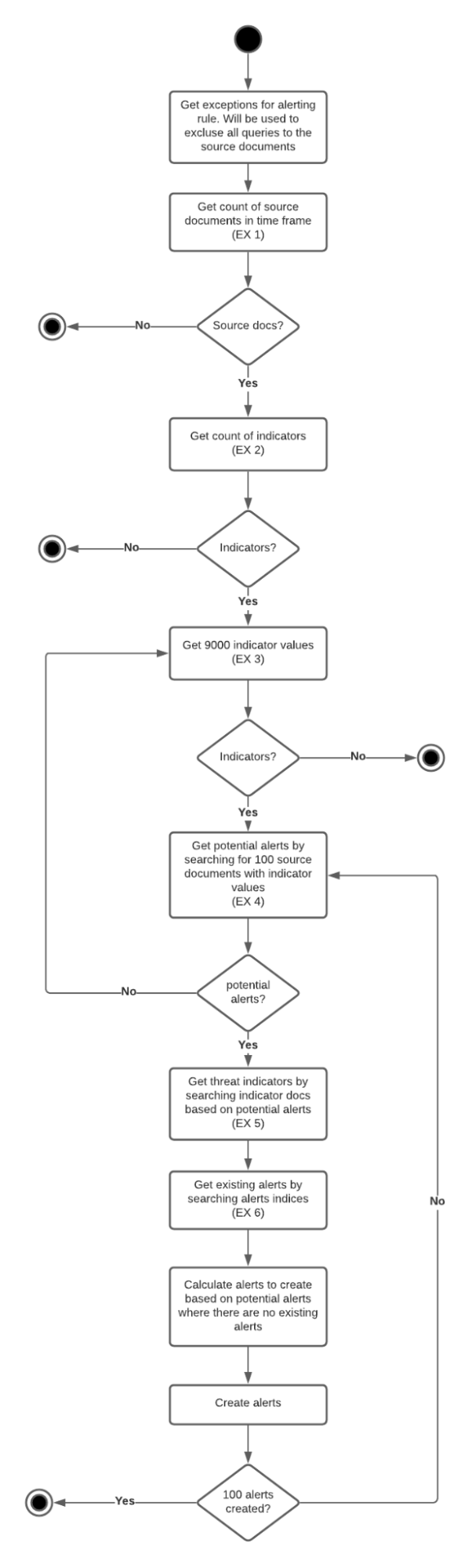 With the assumption that customers have more source event documents than indicator documents, the operation starts by obtaining indicator documents in batches of 9000 that satisfy the threat_query. Found indicator documents are then converted into filters for querying the events index to obtain matching events. Any resulting event hits are then enriched with the respective threats (facilitated by the identifiers baked into the named query, indicators must be requested again for threat.indicator.* fields), and are written to the alerts index with a bulkCreate operation.