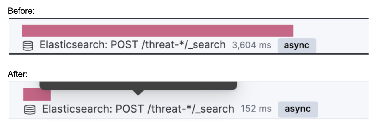 Individual requests can also be observed with APM. The following is the difference between the execution time of an individual query made to the threat index to obtain indicators.