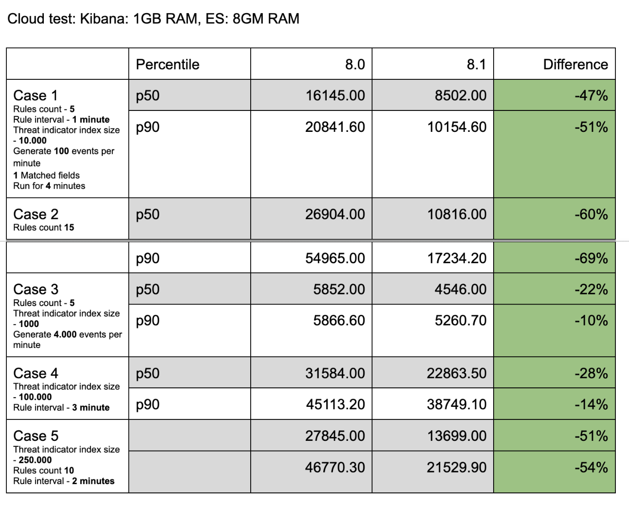 The following are the results comparing the 8.0 and 8.1 branches to one another according to the cases outlined above.