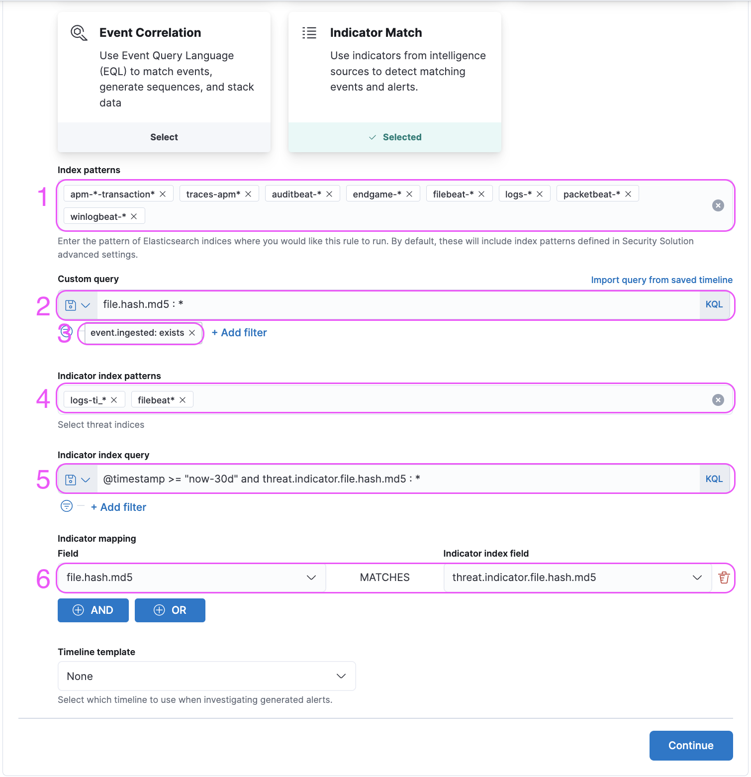 Similar to the defaultIndex UI setting, the value of the defaultThreatIndex is used in the first step of the Create Rule UI, this time for filling out the value of the “indicator index” input. Additionally there are several other places where the defaultThreatIndex values are used as the source index for the indicator events, such as the CTI card on the Overview page, and the indices queried for investigation time enrichments.