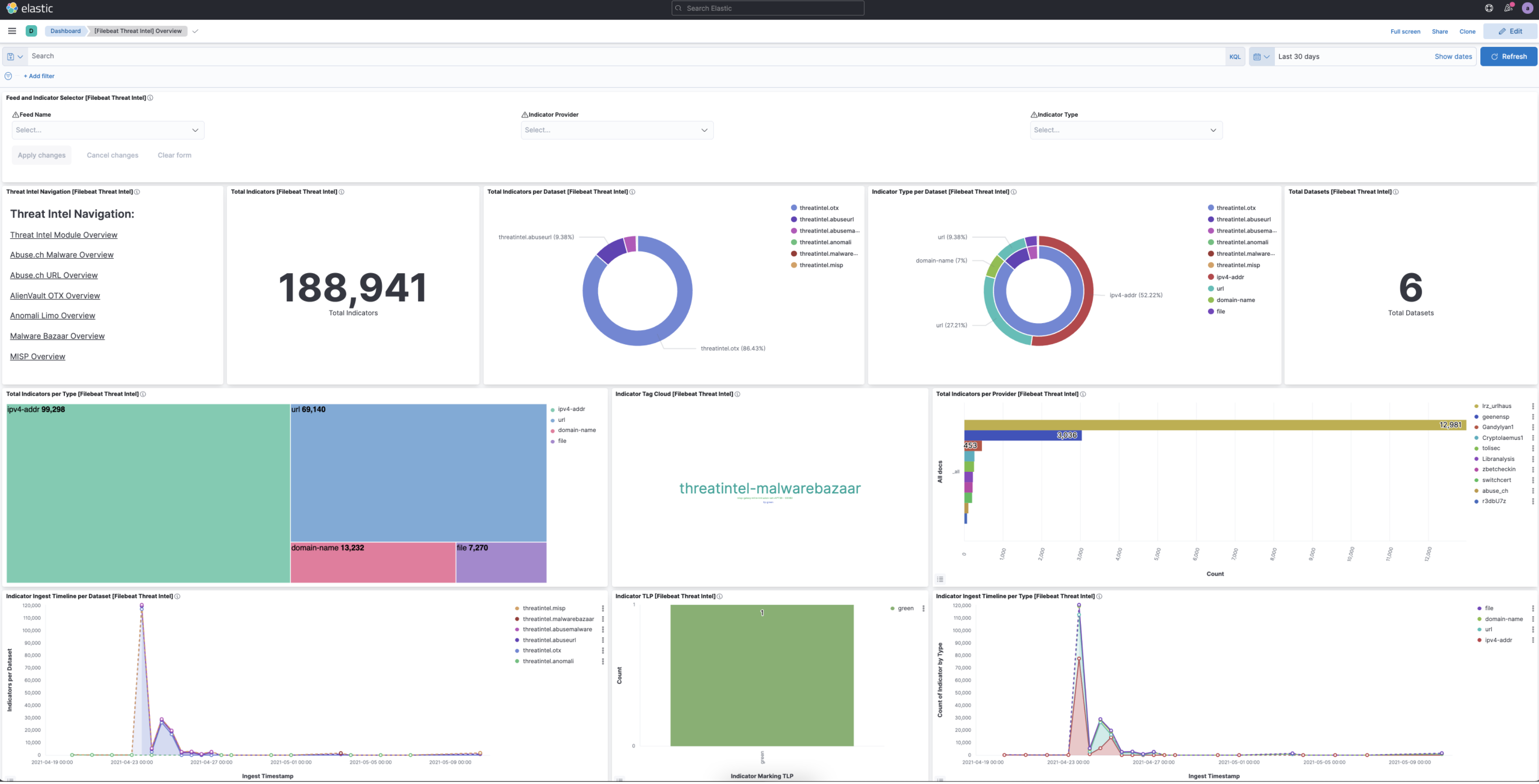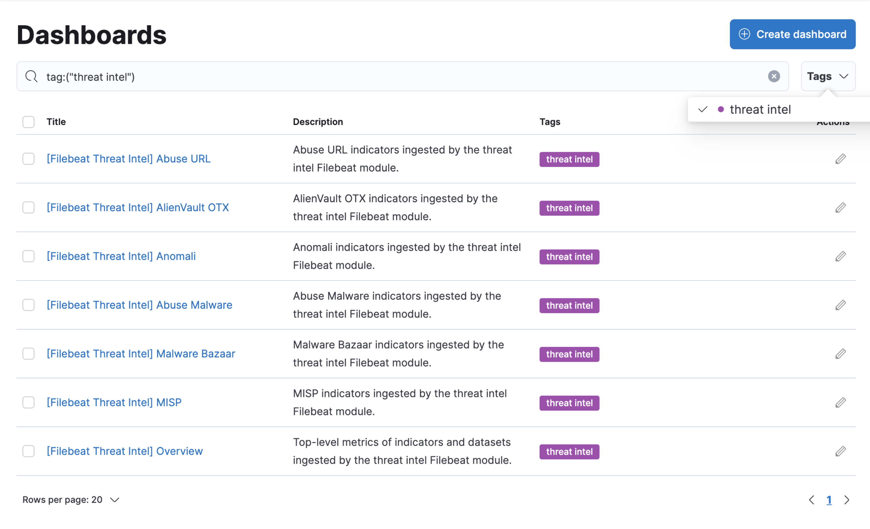 It is also possible to search for threat intelligence dashboards by searching for the “threat intel” tag on the Dashbaords page under the Analyze section of Kibana.