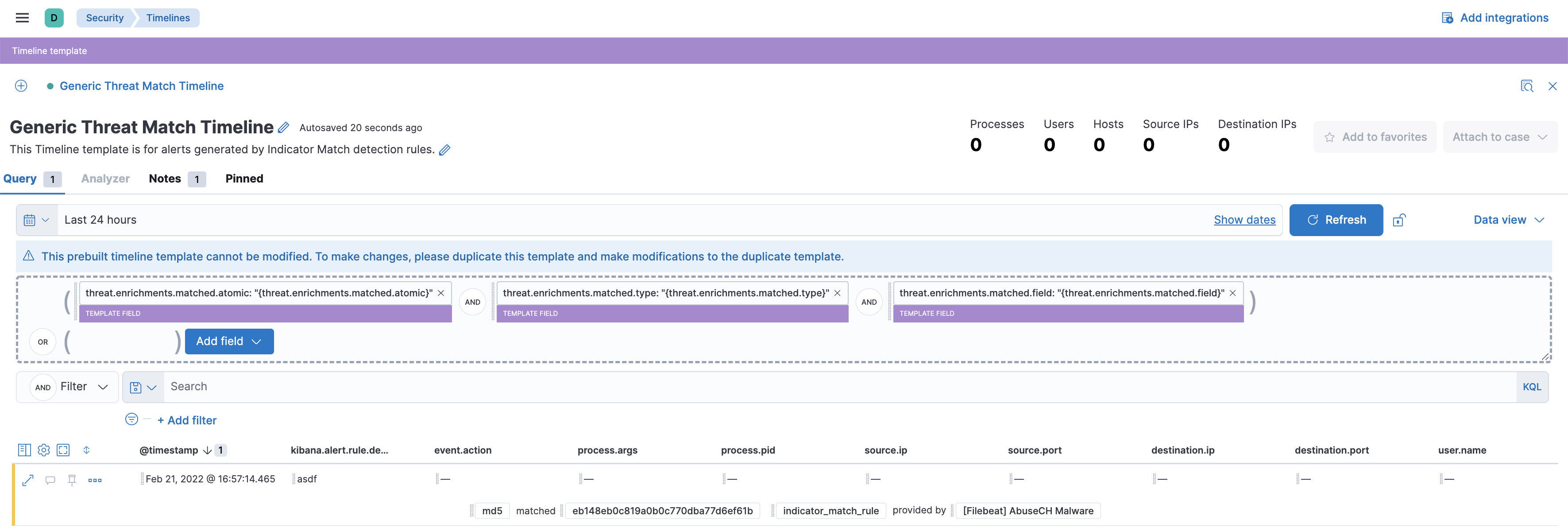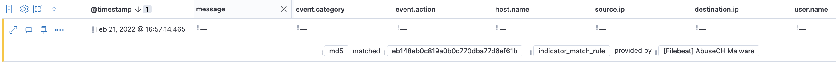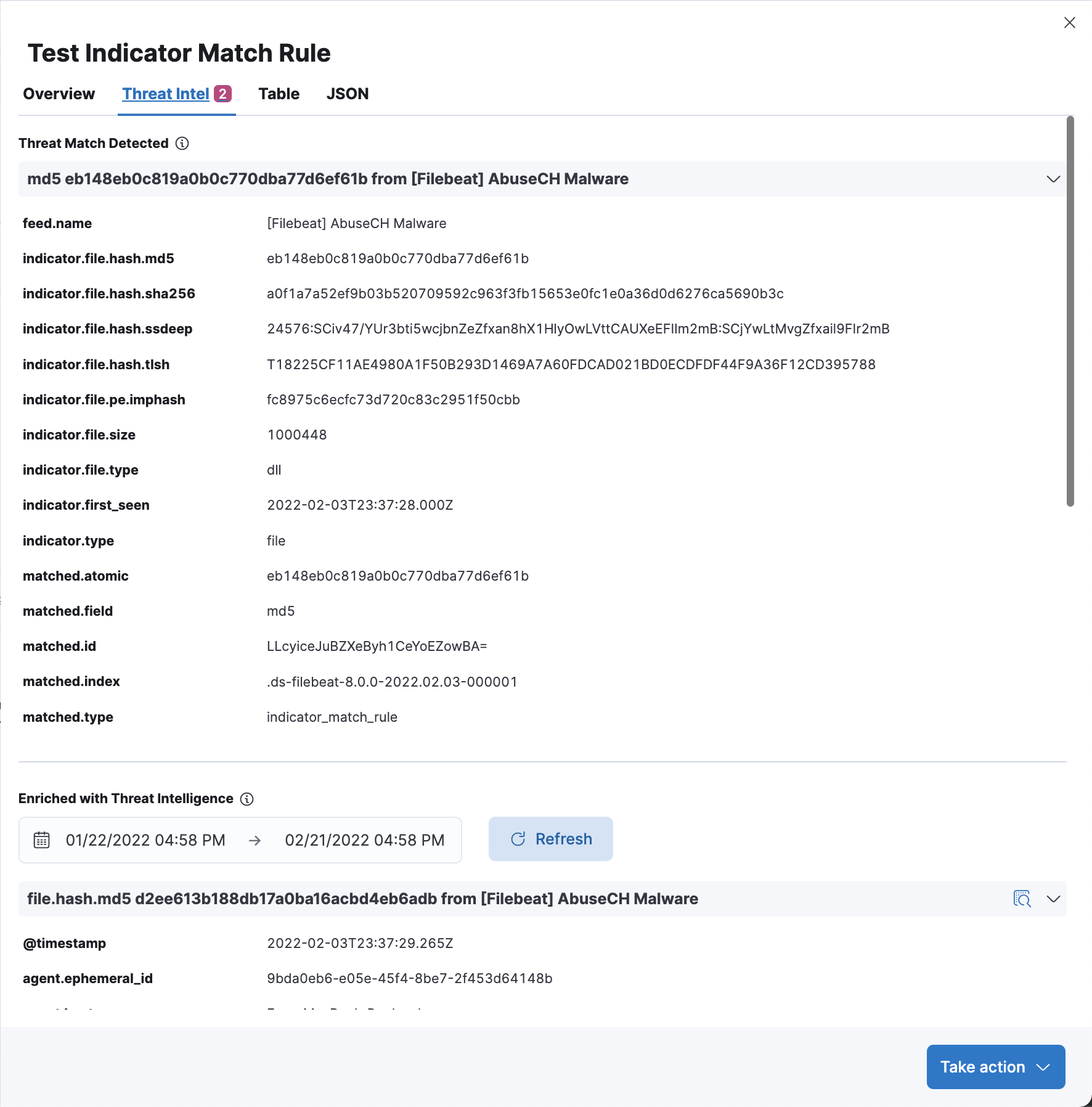 Note: in this example, file.hash.md5 is used for creating the investigation time enrichment. Also, a field named test-field is added to the event. Indicator Match rules work with all events, but ECS compliant fields are recommended for use.POST test-index/_doc