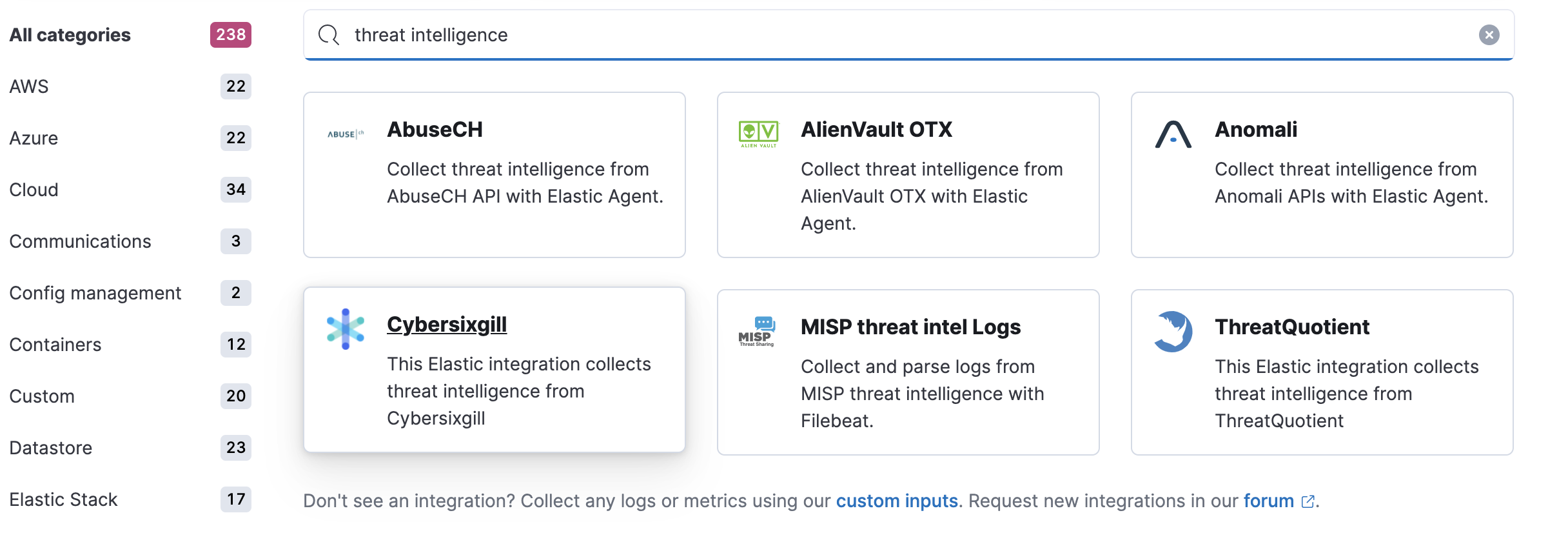 Threat intelligence integrations offered by Fleet can be found on the Integrations page in Kibana. Searching “threat” keyword will yield available threat intel integrations. Fleet Agent must be enabled for ensuring that the indicator events can be ingested. The integrations will populate indices starting with the prefix logs_ti-*, which is the default defaultThreatIndex UI setting value from v8.0 onwards.