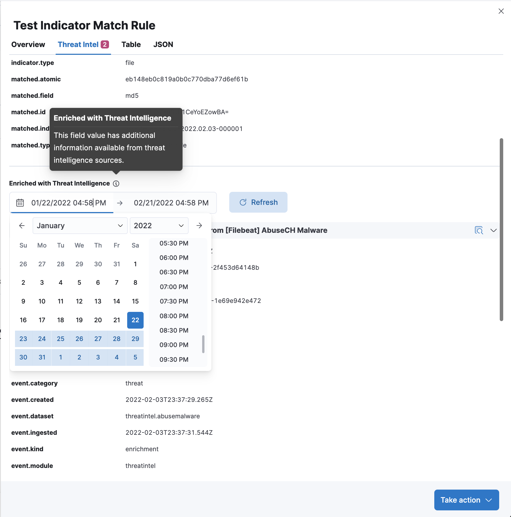 Enrichments added by Investigation Time enrichment logic can be found under the calendar view. The calendar defaults to a 30 day lookup, which can be modified to change the indicator lookup date.