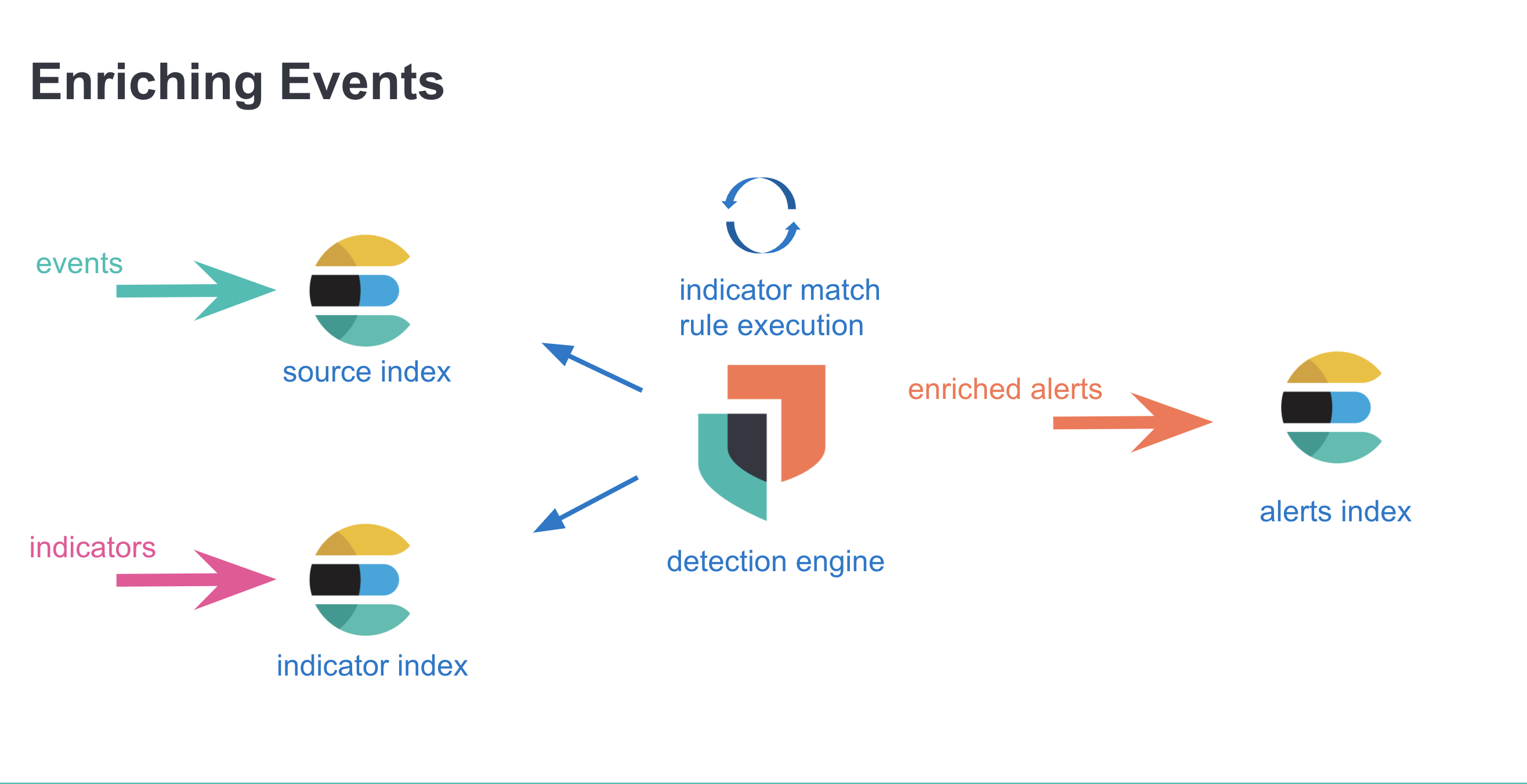 With the assumption that customers have more source event documents than indicator documents, the operation starts by obtaining indicator documents in batches of 9000 that satisfy the threat_query. Found indicator documents are then converted into filters for querying the events index to obtain matching events. Any resulting event hits are then enriched with the respective threats (facilitated by the identifiers baked into the named query, indicators must be requested again for threat.indicator.* fields), and are written to the alerts index with a bulkCreate operation.